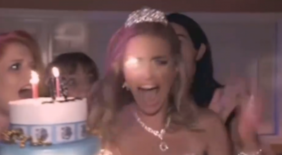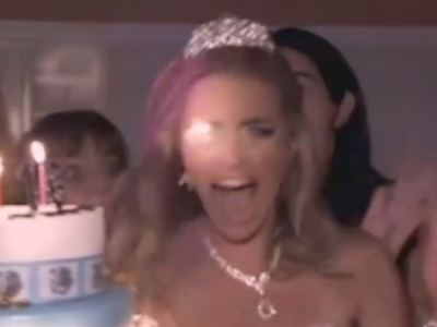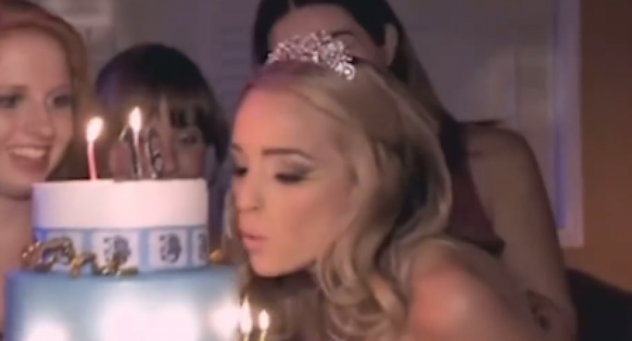Ona na sebi ima dugu korset haljinu od roze šljokica i roze tijaru dok joj je duga plava kosa puštena u vidu talasa. Izgleda da se ona previše približila torti na dva sprata, pa dok je duvala svećice na donjem spratu, svećice na drugom spratu torte su upalile jednu njenu trepavicu. Devojka kreće panično da vrišti, međutim, i ostale njene zvanice kreću da paniče i vrište u isti glas, umesto da joj neko pomogne. Snimak se tu završava, pa se ne zna dalji ishod situacije, ali smatra se da nije bilo većih posledica.