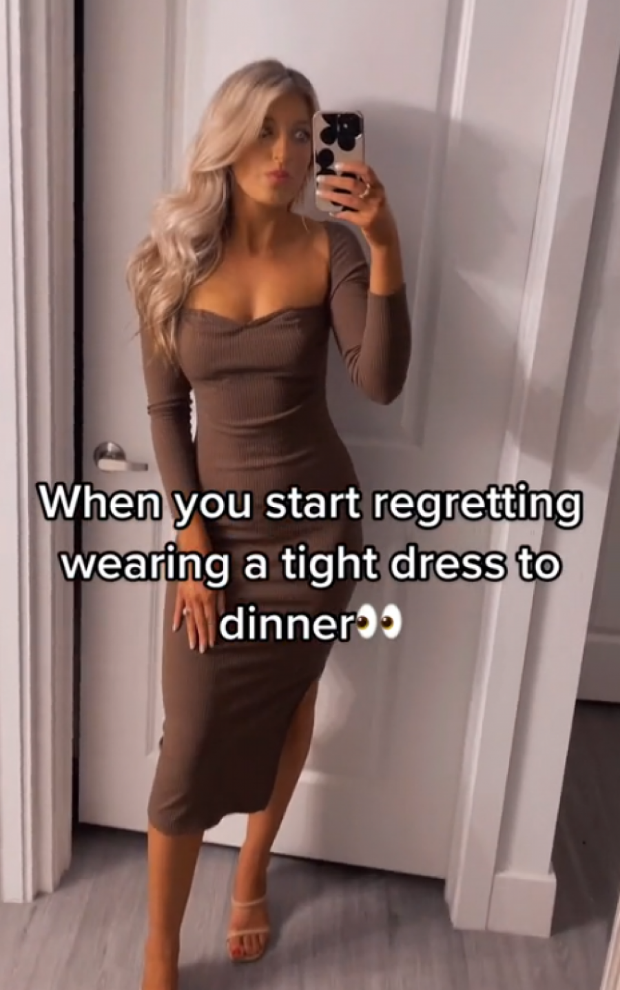 Kada se pogledala u ogledalo pre odlaska na večeru bila je veoma zadovoljna svojim izgledom. Međutim, problem je nastao posle večere. Nije tajna da mnogi ljudi pate od nadutosti stomaka posle obroka. Takođe stomak može da bude naduven ukoliko pojedemo više nego inače. Uska garderoba koja ide tik uz telo tako može da istakne sve nedostatke, a ova devojka imala je upravo taj problem.