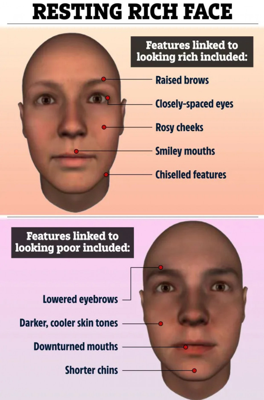 Sa druge strane "siromašnija lica" imala su spuštene obrve, kraće brade, spuštena usta i tamnije, hladnije tonove kože. Rejčel Džek profesorka sa Univerziteta u Glazgovu rekla je da ovo istraživanje pokazuje kako specifični atributi lica igraju ključnu ulogu u povezivanju shvatanja društvenog staleža sa nekim stereotipima.