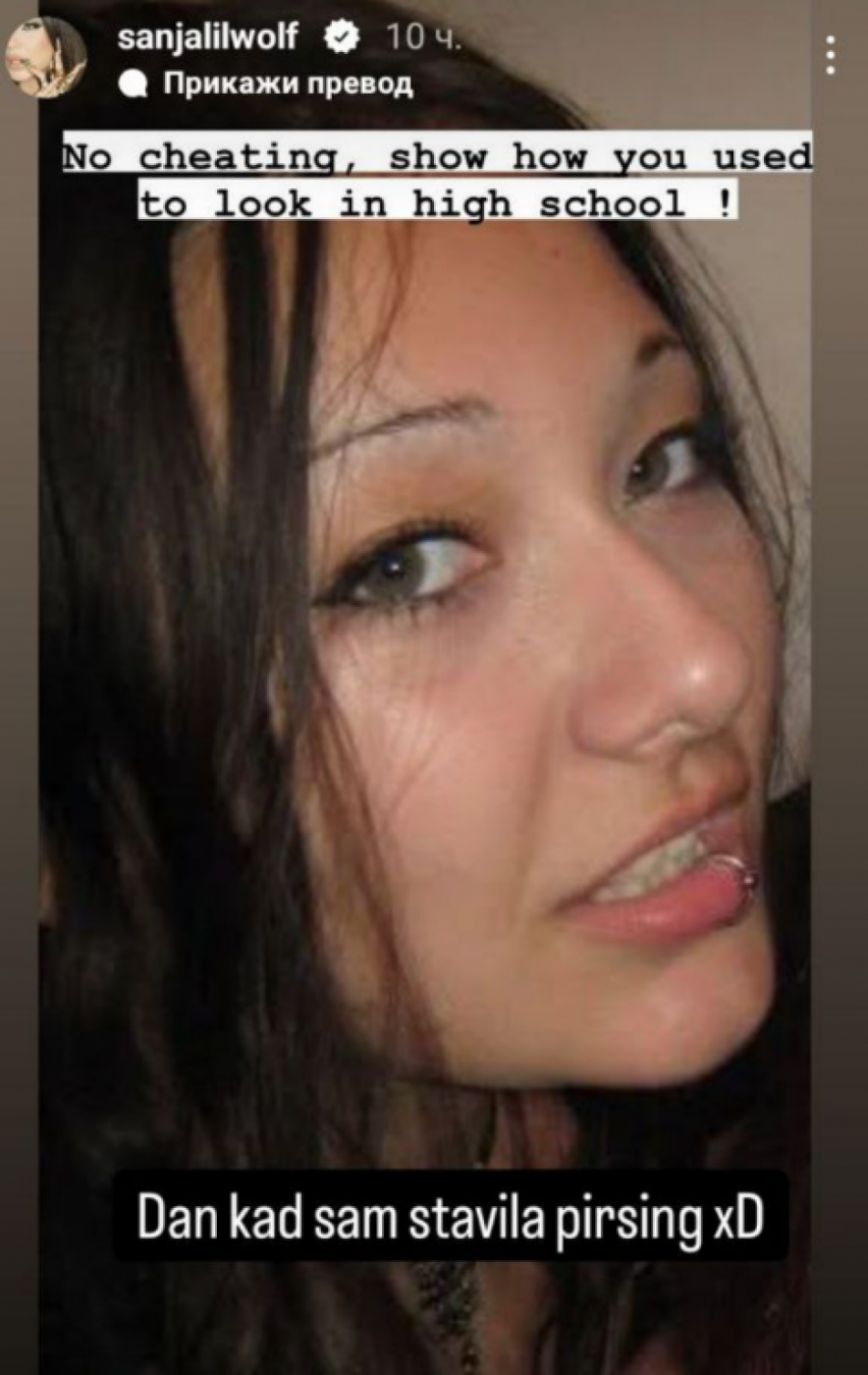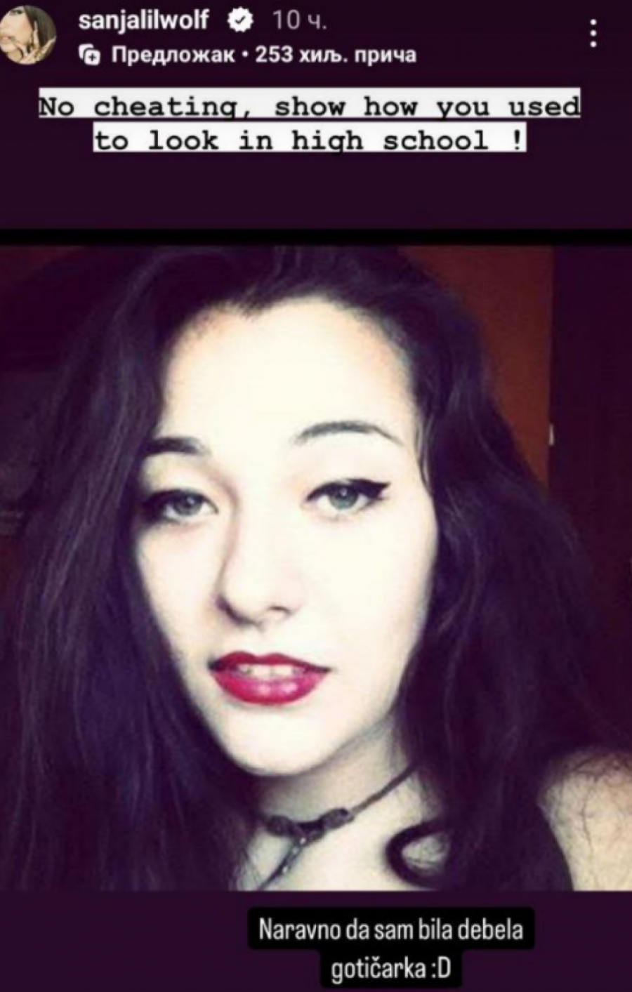 Ona je objavila dve fotografije, dok je na prvoj dodala "Naravno da sam bila debela gotičarka". Na fotografiji je Sanja iz mlađih dana, ima debeli sloj ajlajnera, kao i bordo karmin. Ono što je primetno je da su joj obrve vidno stanjene i drugačijeg oblika, dok ima i čoker ogrlicu oko vrata.