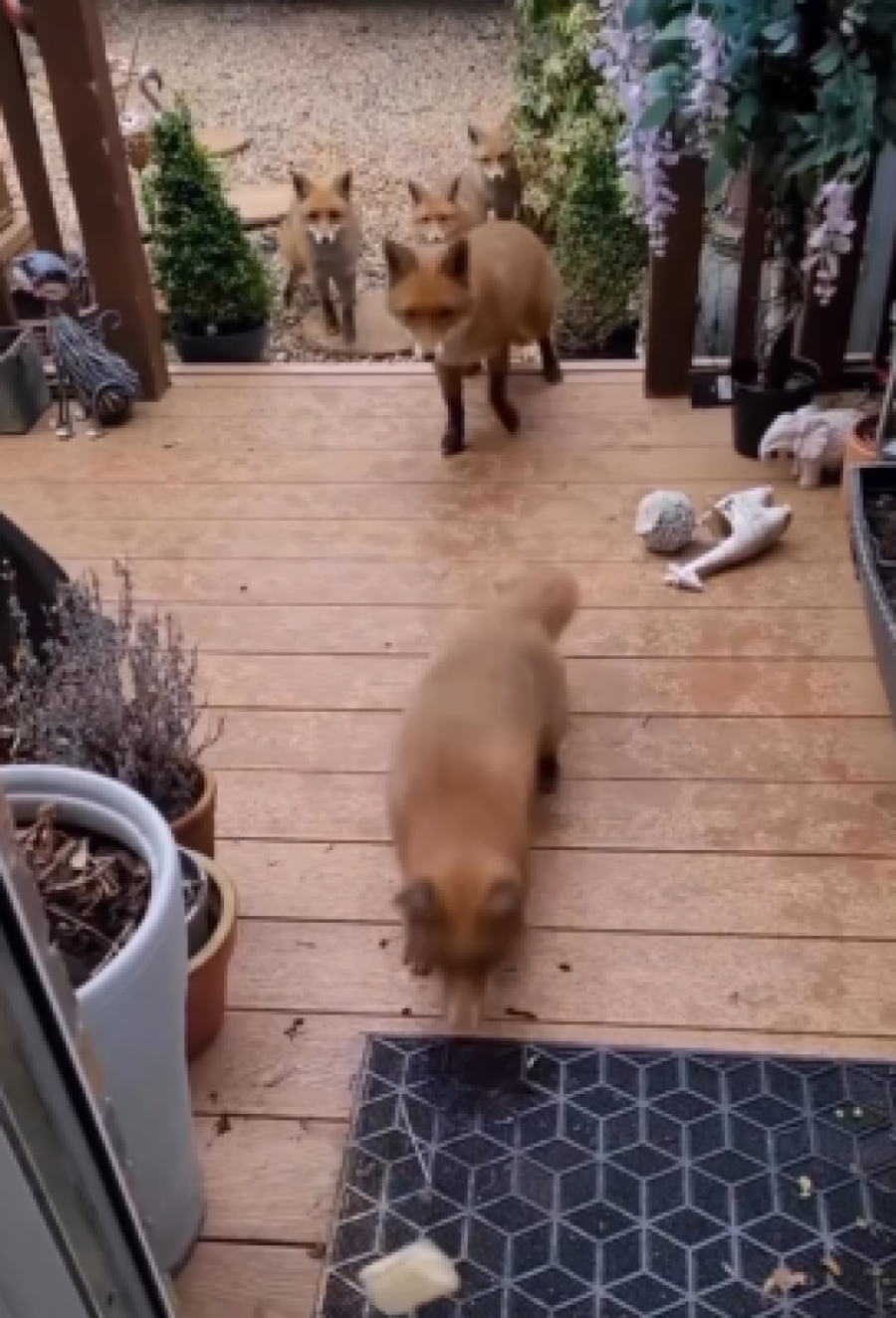 U narednih nekoliko sekundi snimka vidimo da gazda kuće lisicama baca hranu, dok su one jedna po jedna strpljivo čekale svoj komad. Pošto su namirene, sve lisice su se povukle, dok na snimku vidimo da se i treća mačka penje na ogradu pored kuće i uskače unutra kroz otvorena vrata.