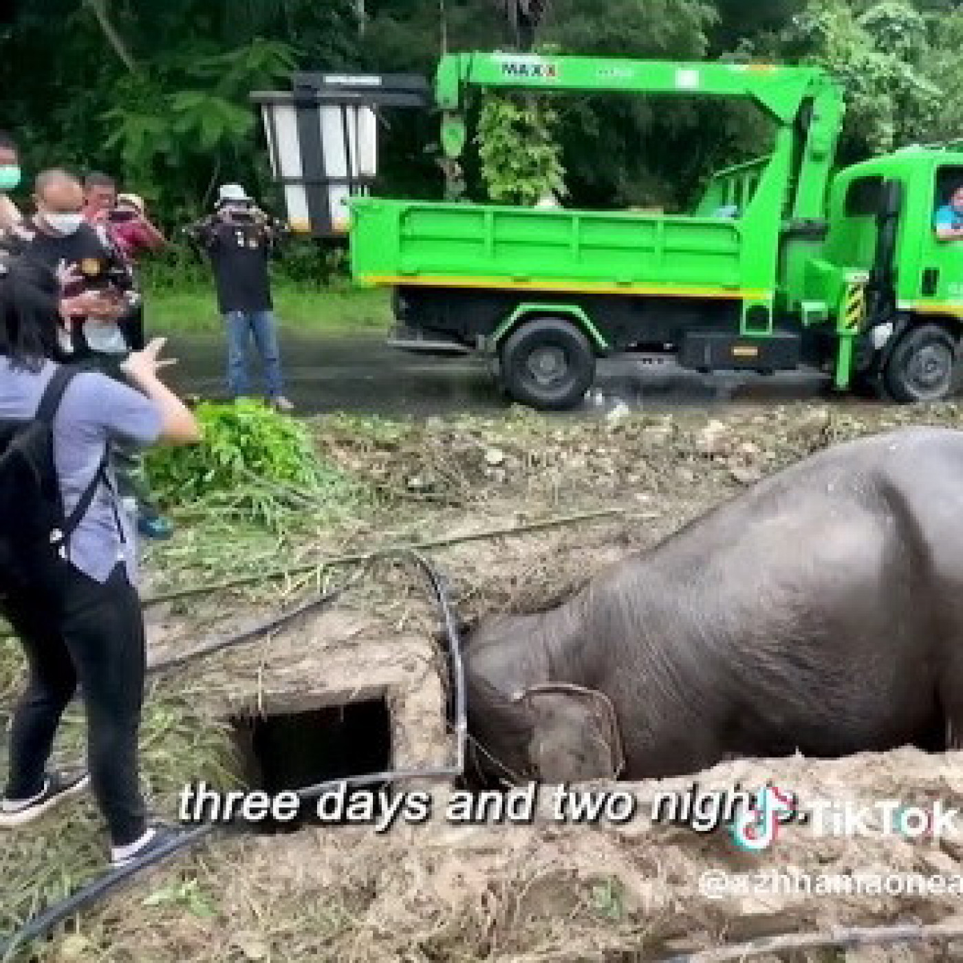 Spasioci zaposleni u rezervatu za životinje na Dalekom istoku su jednog izuzetno kišovitog dana u njemu zatekli stravičnu scenu. Pronašli su ženku slona zaglavljenu u dubokoj jami kako na taj način pokušava da doji svoje mladunče koje je očigledno ranije upalo u veliku rupu i nije imalo načina da izađe. Očajna majka bacila se preko otvora kako bi njene dojke dospele do bebe, pri čemu su joj zadnje noge ostale van jame, dok je glavom bila zaglavljena za njen drugi kraj. Bez mogućnosti da se pomeri ona je bez hrane i bez vode provodila sate, nesebično dajući svoj život za život svog mladunčeta.