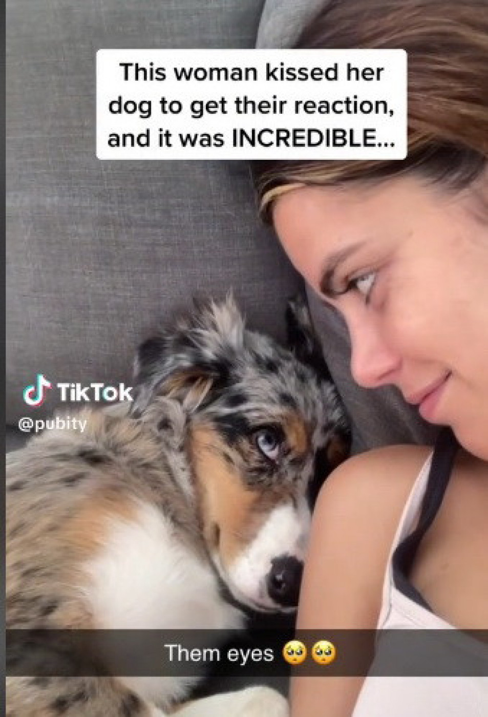 Na snimku se vidi devojka koja je poljubila svog psa dok su sedeli u dnevnom boravku, želeći da zabeleži njegovu reakciju. Nakon što je dobio poljubac, pas je stidljivo i nežno ispod obrva pogledao svoju gazdaricu, dajući na taj način potvrdu da je voli da mu njeno društvo prija. On je svoju njušku naslonio na njeno rame gledajući je poput čoveka.