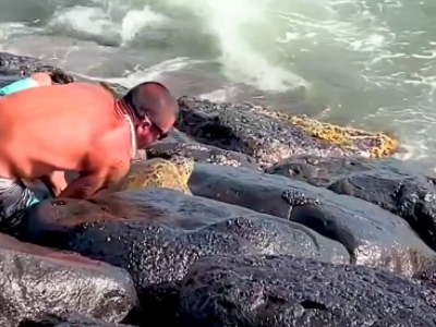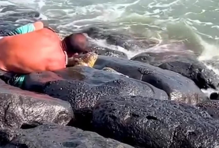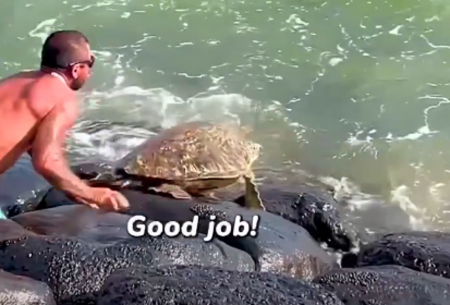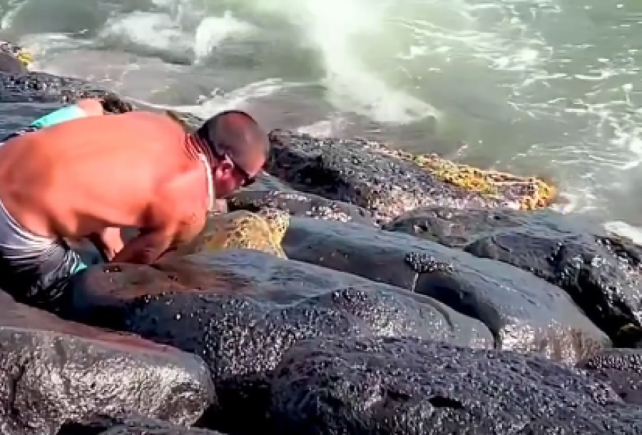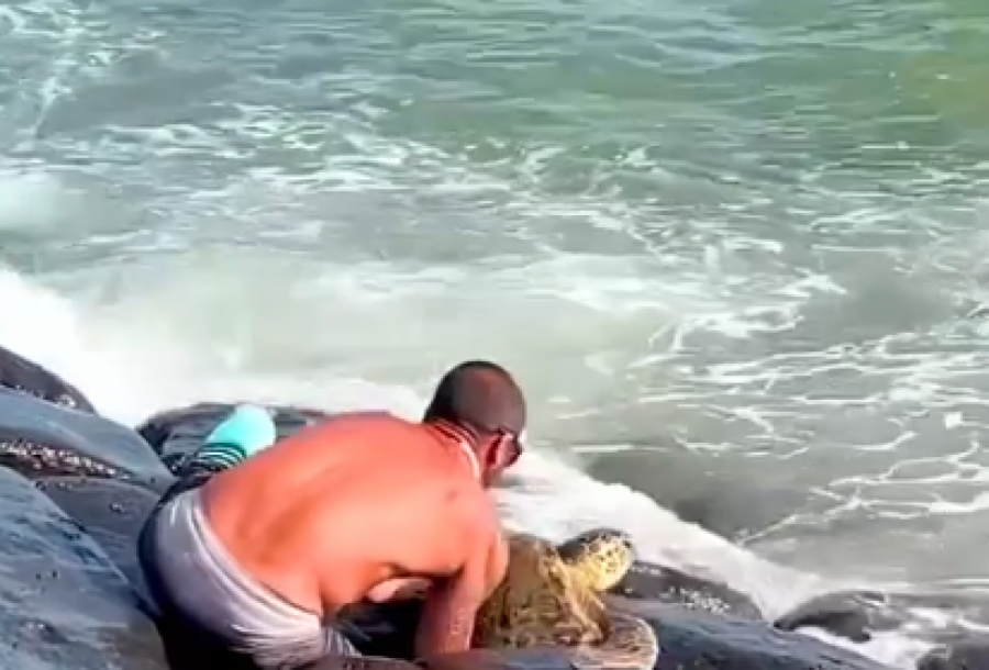 Snimak spašavanja jedne džinovske kornjače dobio je brojne pohvale za uspešnu akciju. Na snimku se vidi čovek koji je očigledno krenuo na kupanje ili surfovanje, s obzirom da je okean poznat po velikim talasima, i ugledao je stvorenje zaglavljeno između dve stene koje je pokušavalo da se dočepa slobode.