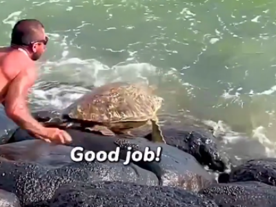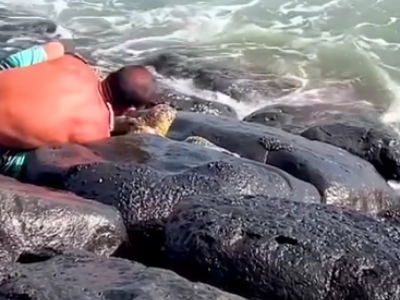 Ovaj video snimak postao je viralan na drušvenoj mreži Instagram i do sada je sakupio 611.000 sviđanja. Naime, čovek se približio čudnom biću zaglavljenom između dve stene i shvatio da je u pitanju džinovska kornjača. On je bez mnogo razmišljanja dotrčao i pokušao da pomogne bespomoćnoj životinji, međutim to je bilo malo teže s obzirom da je težina ove vrste kornjače na zavidnom nivou. Talasi su zapljuskivali ovog junaka koji je svu snagu koristio kako bi izvukao kornjaču da bi je vratio u okean i uspeo je tek iz trećeg puta. Životinja je zaplivala i videlo se da je i njemu pao kamen sa srca.