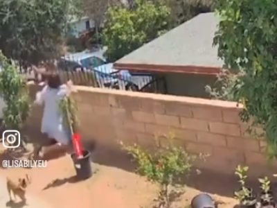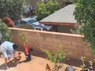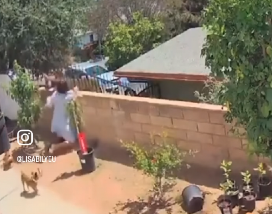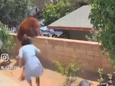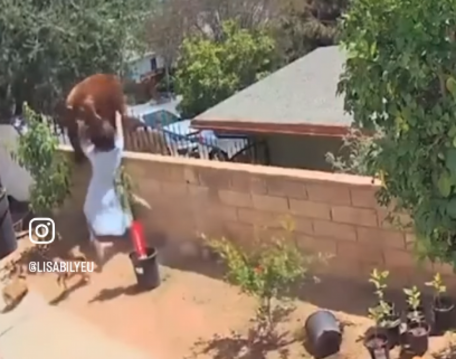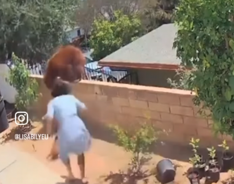 Žena, koja izgleda kao da je u spavaćici, goloruka izlazi pred medveda kako bi odbranila svoje pse. Ova žena nije imala kada da razmišlja i instinktivno je odreagovala rukama gurnuvši medveda sa zida. Medvedica je izgubila ravnotežu i pala sa zida koji nije bio preterano visok, dok je žena pokušala da hvata i spašava pse, noseći jednog u rukama. Dok žena hvata pse u pozadini se vidi medvedica koja takođe beži iz ovog dvorišta gde je napadnuta od strane svih.