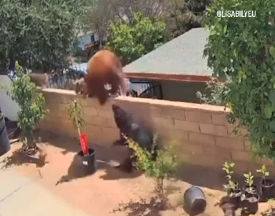 Ovaj video je samo na Instagramu dobio 368.000 sviđanja, a mnogi su se složili da su morali više puta da ga pregledaju kako bi shvatili šta se tu sve izdešavalo. Vešto oko spoljašnje kamere je sve uhvatilo, a ukoliko se ne obrati pažnja sve deluje kao konfuzna borba u kojoj se bore svi sa svima, a zapravo je drugačija priča. Izgleda da je medvedica u potrazi za hranom došla u posed jedne kuće. Ona je bila ograđena visokim zidom i kapijom, ali medvedica zajedno sa svoja dva mečeta se popela na taj zid. Ona je pokušavala da svesno upadne na tuđ posed kako bi došla do hrane, ali nije se nadala da se u tom domaćinstvu nalazi pas, i to ne jedan, već četiri.