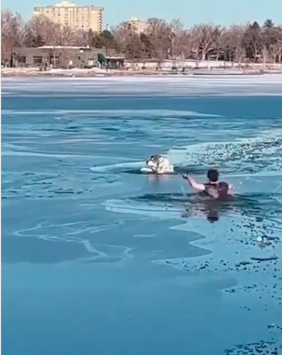 Njegov vlasnik je bez puno razmišljanja pohitao kroz ledenu vodiu kako bi spasao svog ljubimca. Neko od njegovih prijatelja je snimio trenutak spašavanja psa. Naime. momak pliva kroz vodu, razbijajući led pred sobom. Bilo je potrebno neko vreme dok je došao do psa. Pošto je uspeo da probije led kroz, vukao je psa i doplivali su istim putem.