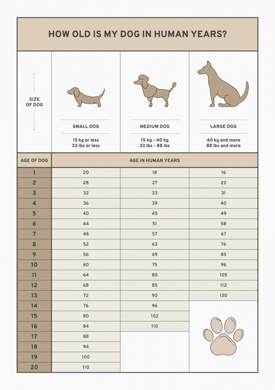 U prvoj godini života psa, oni veoma brzo stare. Za male i srednje pse ovu godinu možemo izjednačiti sa oko 15 ljudskih godina. Za veće rase jedna godina može biti bliža 9-10 ljudskih godina. Druga godina života psa je takođe relativno brza u pogledu starenja. Možemo ga izračunati kao 9-12 ljudskih godina za male i srednje pse i 6-7 ljudskih godina za veće pse.