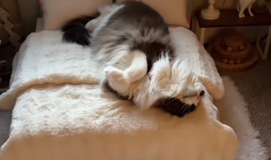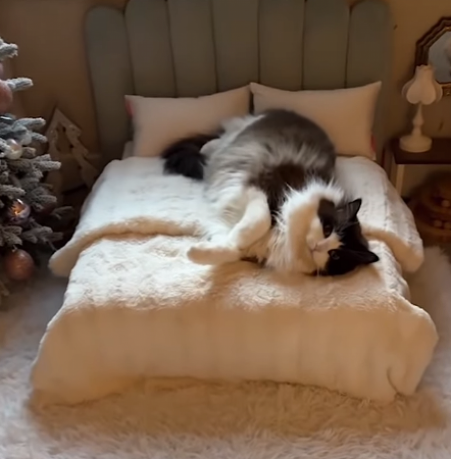 Snimak koji je nasmejao mnoge, ali i izazvao podeljne reakcije pojavio se na Instagramu i prikazuje sobu koja je po svoj prilici opremljena samo za mačku. Vrata su otvorena i vidi se da unutra leži neka vrsta persijske mačke crno-bele boje koja se odmara na krevetu. Međutim to nimalo nije običan krevet. To je bračni krevet sa sve posteljinom, naslonom za krevet i dva jastuka, a tačne je veličine ove mačke. Maca se zadovoljno proteže po njemu, dok je krevet ispod prozora na kome je i zavesa. U sobi se regularno pali i svetlo.