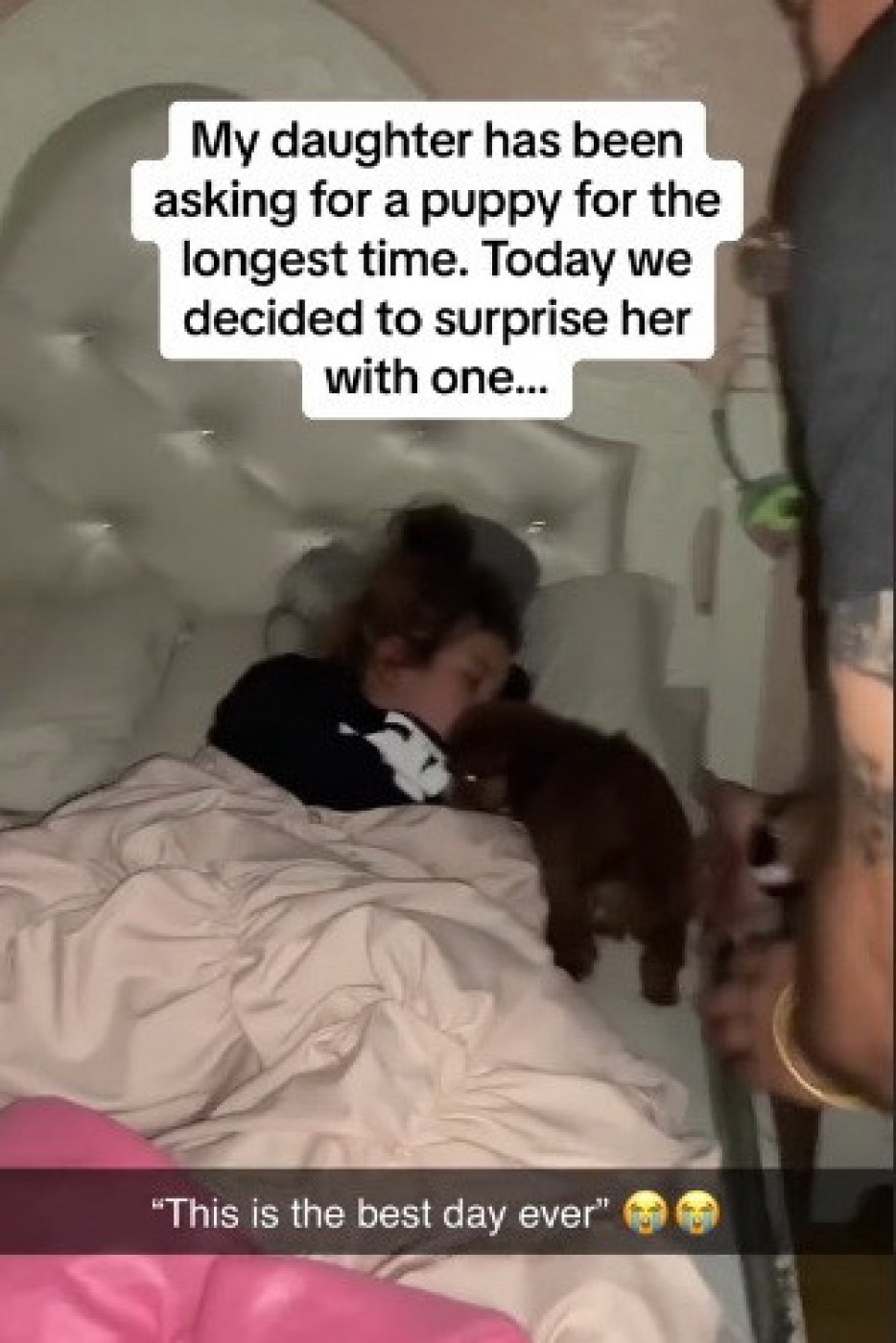 Dok je devojčica spavala i nije imala predstavu šta je čeka, malo štene je bilo stavljeno kod nje u krevet na postelju kako bi iznenađenje kada se probudi bilo potpuno. Devojčica je u jednom trenutku otvorila oči pogledala roditelje, a onda i malo štene te je širom otvorila oči i od šoka bukvalno zanemela.