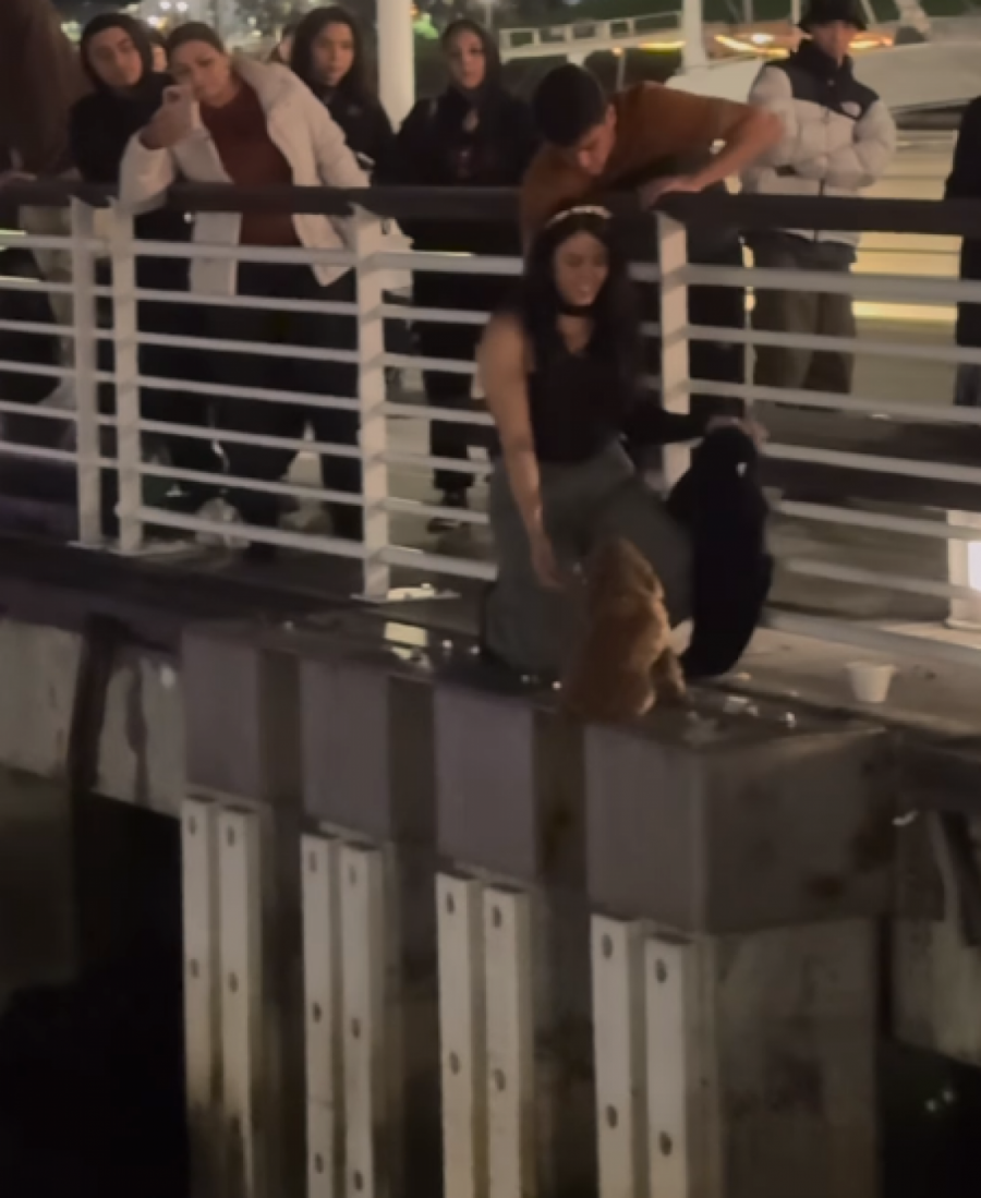 Devojka je pokazala neverovatnu hrabrost kada je preskočila ogradu sa mosta kako bi spasila malenog psa koji je bio u opasnosti da padne. Dok ju je dečko sa sigurne strane mosta pridržavao, ona je brzom reakcijom uspela da uhvati psića i vrati ga na sigurnu stranu mosta.