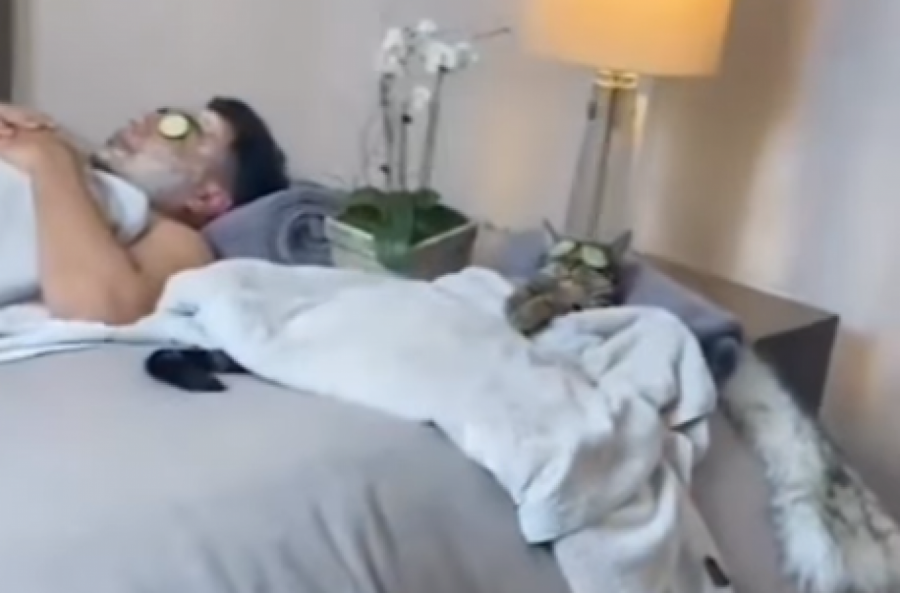 Žena je ušla u spavaću sobu i zapanjila se kad je ugledala nesvakidašnju scenu. Njen suprug je rešio da sebi napravi “spa dan” u kome će maksimalno uživati. On je pustio relaksirajuću muziku, dok je ležao na krevetu kao posle masaže. Na licu je masku za negu, a tu su i dva neizbežna koluta krastavca kojima je pokrio oči. Međutim, ono to je bilo neobično je njihova mačka koja je ležala do njega u identičnom izdanju.