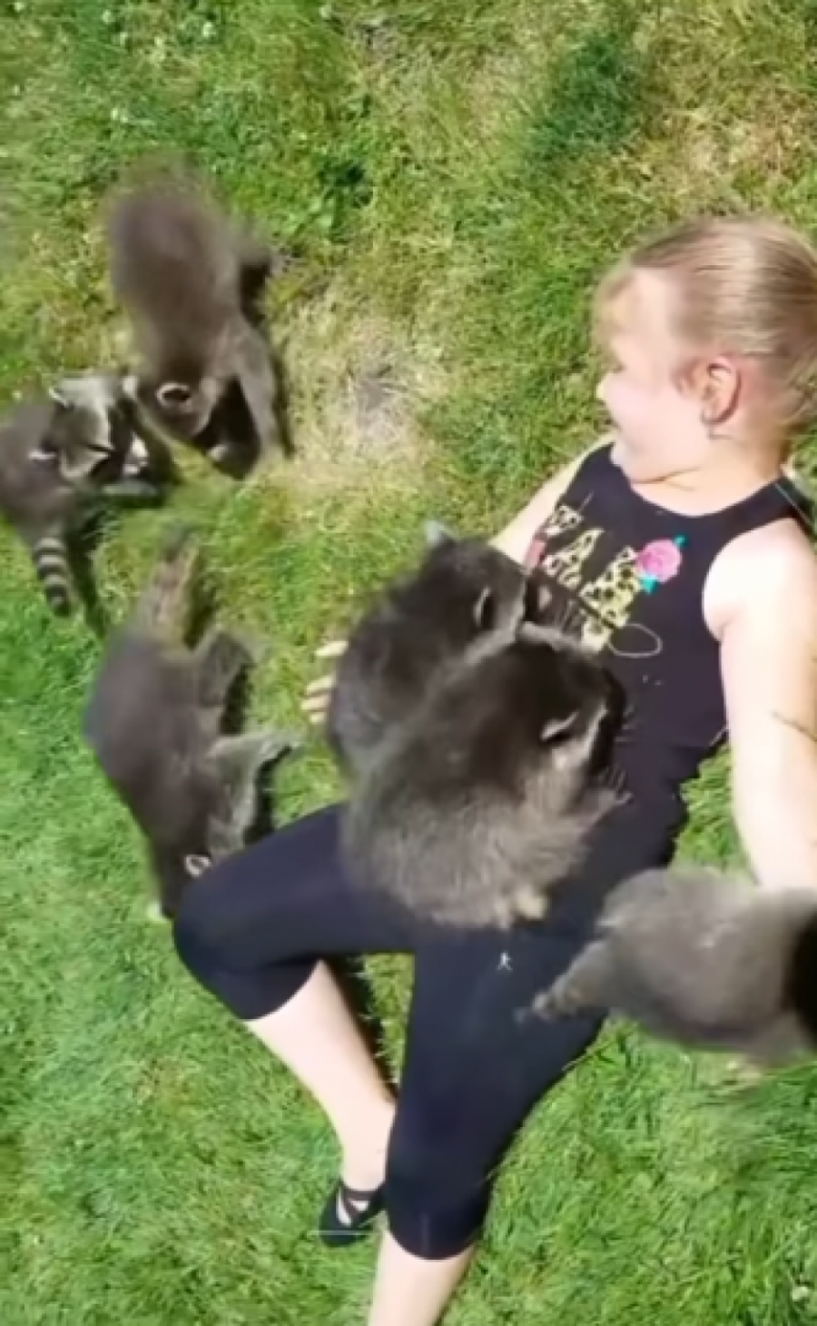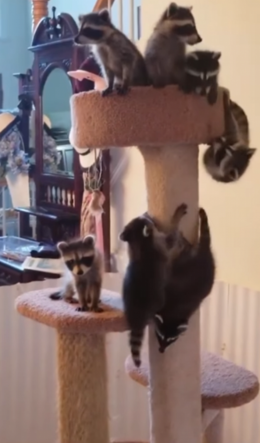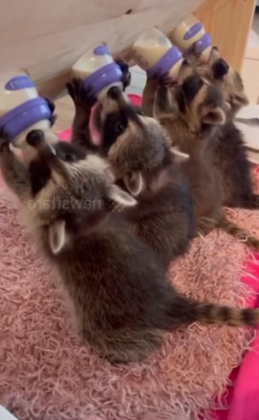 Porodica nije želela da ih prepusti neizvesnoj sudbini, koja za bebe rakune, koji još nisu bili ni progledali, ne bi bila blagonaklona. Zato su svi ukućani prionuli na hranjenje i negovanje čak sedam mladunaca. Kasniji snimci pokazuju koliko su oni lepo napredovali i porasli, a očigledno su ostali kućni ljubimci. Tako su im postavili grebalice za mačke unutar kuće, a napravili su im i pravi poligon. Čak ih je i njihov pas, rase čivava, prihvatio.
