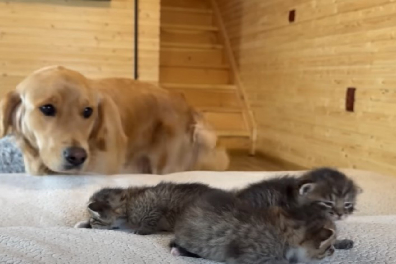 Nala, kako je ime zlatnog retrivera, ušla je u sobu i prišla krevetu, a onda nije krila vidno uzbuđenje što vidi preslatke drugare sa kojima je znala da će deliti isti prostor. Iako ju je vlasnica sve vreme kontrolisala i držala na oku, ona je bila pažljiva prema mačićima pa ih je sve vreme obilazila okolo i gledala sa oduševljenjem.