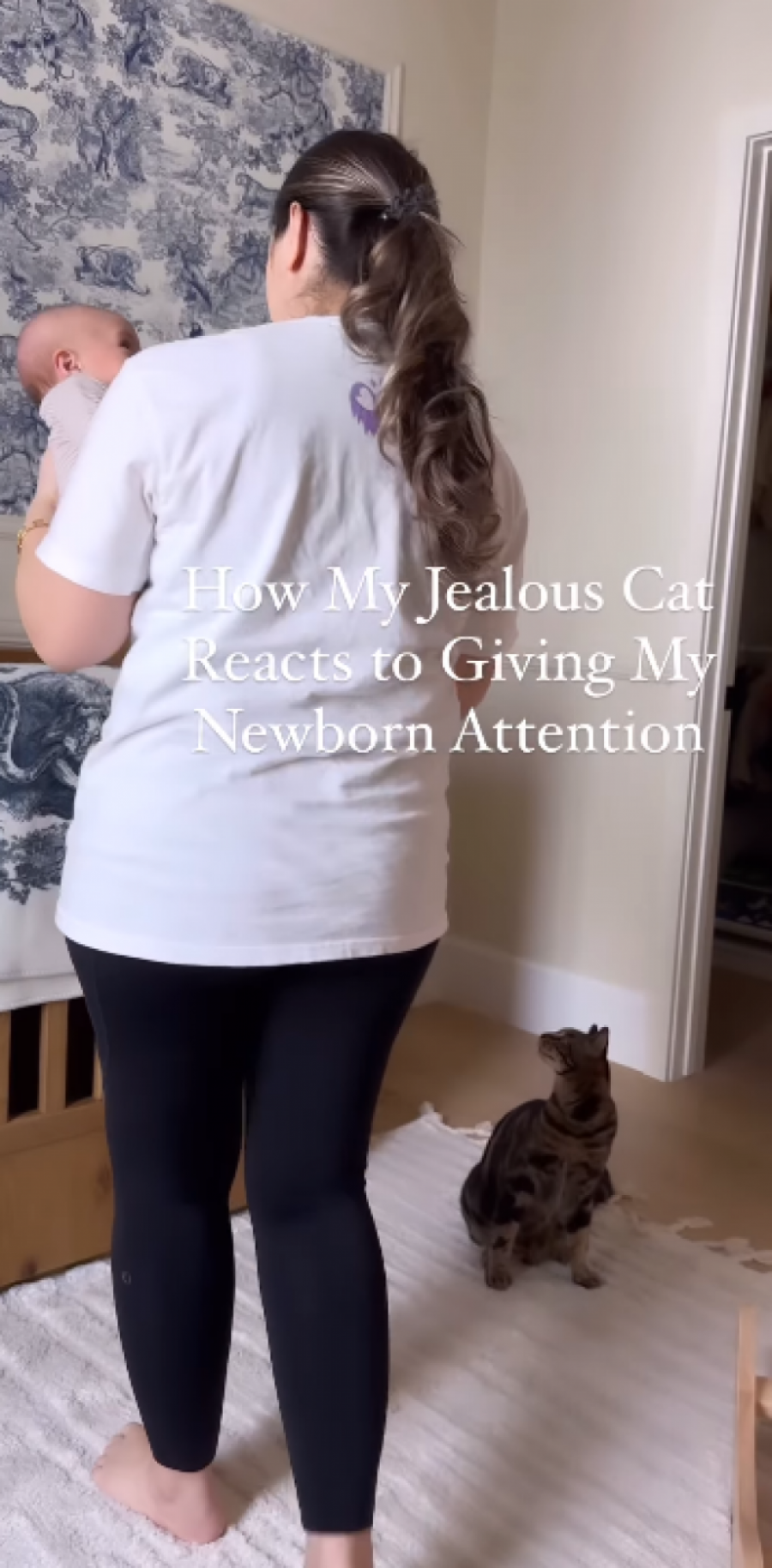 Mama je ušla sa bebom u naručju i nežno mu šaputala. Međutim, dok je pokušavala da spusti novorođenče u krevetić, njen mačor Čejs nije mogao da sakrije znatiželju i očiglednu ljubomoru. Dok je žena pažljivo nameštala bebu, Čejs je takođe uskočio unutra zahtevajući pažnju.