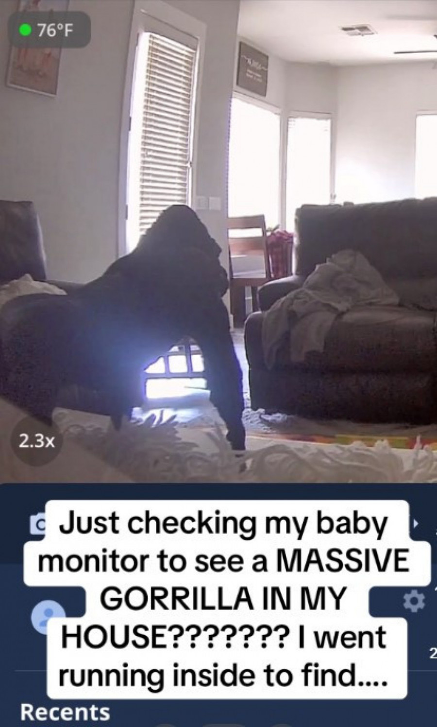 Jedna majka iz SAD doživela je pravi trenutak panike kada je pogledala na bebi monitor i primetila ogromnu gorilu kako stoji ispred sofe u njenoj dnevnoj sobi. Iako je odmah pomislila da je životinja upala u njen dom, ispostavilo se da je scena imala mnogo manje dramatičnu pozadinu.