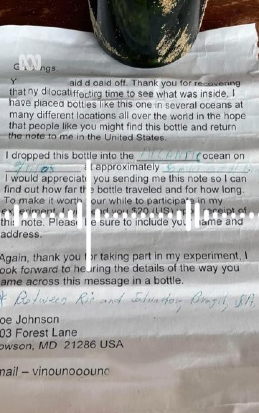 Toni, stanovnik australijskog grada Piterboroua, uživao je u opuštenoj šetnji duž plaže kada je naišao na staklenu bocu prekrivenu peskom i školjkama. Na njegovo iznenađenje, shvatio je da unutra ima poruka, i radoznalo je počeo da je čita.