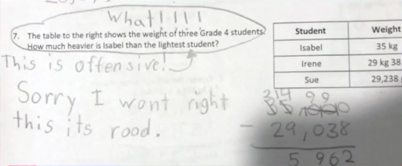 Pitanje je bilo koncipirano tako da ona treba da odgovori koliko je devojčica po imenu Izabela teža od najlakše učenice. Uz pitanju je stajala i tablica u kojoj su bila napisana imena tri imaginarne učenice i njihova težina. Devojčica je upravo taj zadatak odbila da uradi jer je smatrala da je pitanje neprimereno i uvredljivo, te je odlučila da ne želi da da odgovor na njega.