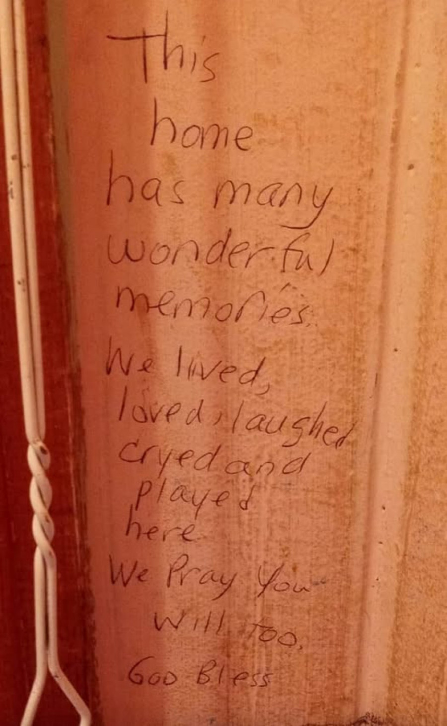 Prema poruci koju je ostavio par, kuća je bila ispunjena "divnim uspomenama". Na zidu je pisalo: "Ovde smo se voleli, smejali, plakali i igrali. Molimo se da i vama bude tako. Bog vas blagoslovio".