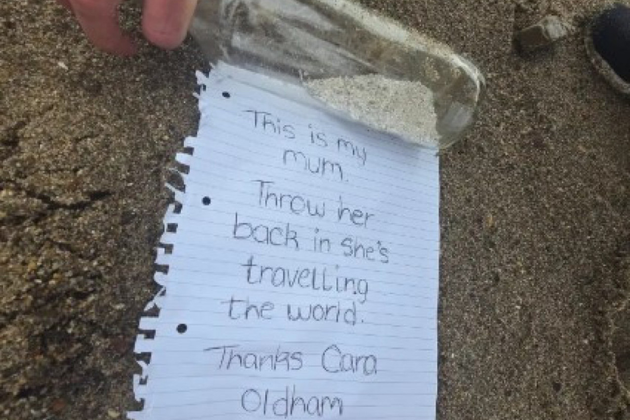 Šetajući po plaži u Skegnesu u Velikoj Britaniji, jedna žena se iznenadila kada je u pesku pronašla bocu sa porukom. Sve je delovalo kao filmska priča, osim što je u flaši zaista bila cedulja sa porukom, kao i pepeo pokojnika.