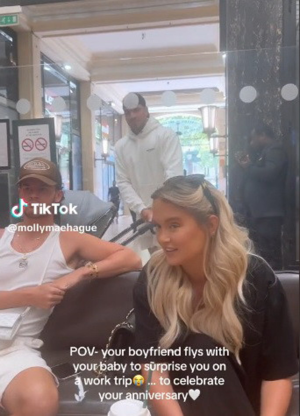 Moli Mej Hejg je poznata influenserka koja je imala prilike da otputuje na takav jedan poslovni put ostavivši kod kuće svog dečka sa bebom. Poznata Tiktokerka je bila zanesena u priči sa kolegama kada se iznenada u hotelu u lobi kutku iznenada pred svima pojavio njen partner sa njihovom bebom.
