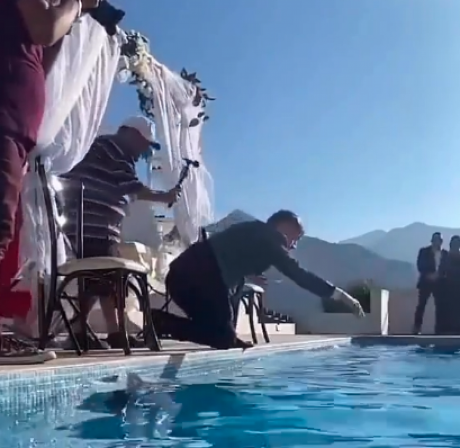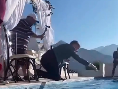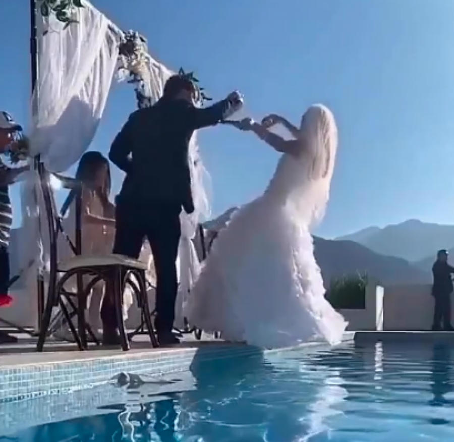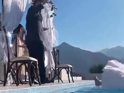 Mladoženja i svi gosti su vidno zapanjeni situacijom. Sve oči su uprte u mladoženju od koga se očekivalo da barem skoči za svojom mladom koja je mokra do kože. Međutim, on zbunjeno i dalje stoji na ivici bazena, a potom je čučnuo i rukom dozivao nevestu da dopliva do njega i izađe iz bazena.