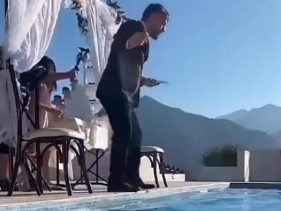 Sklapanje braka je izgleda prošlo u redu, kao i muzika i trpeza. Mlada i mladoženja zadovoljno stoje kraj bazena dok je fotograf u njihovoj neposrednoj blizini i deluje kao da je kucnuo čas za fotografisanje. Nevesta u raskošnoj venčanici nazdravlja mladoženji dok degustiraju tortu, kada se niotkuda pojavljuje devojčica od nekih 10 godina. Ona se zatrčava i planski gura mladu pravo bazen. Nesrećna nevesta je zaista i upala u bazen, što se moglo videti na usporenom snimku.