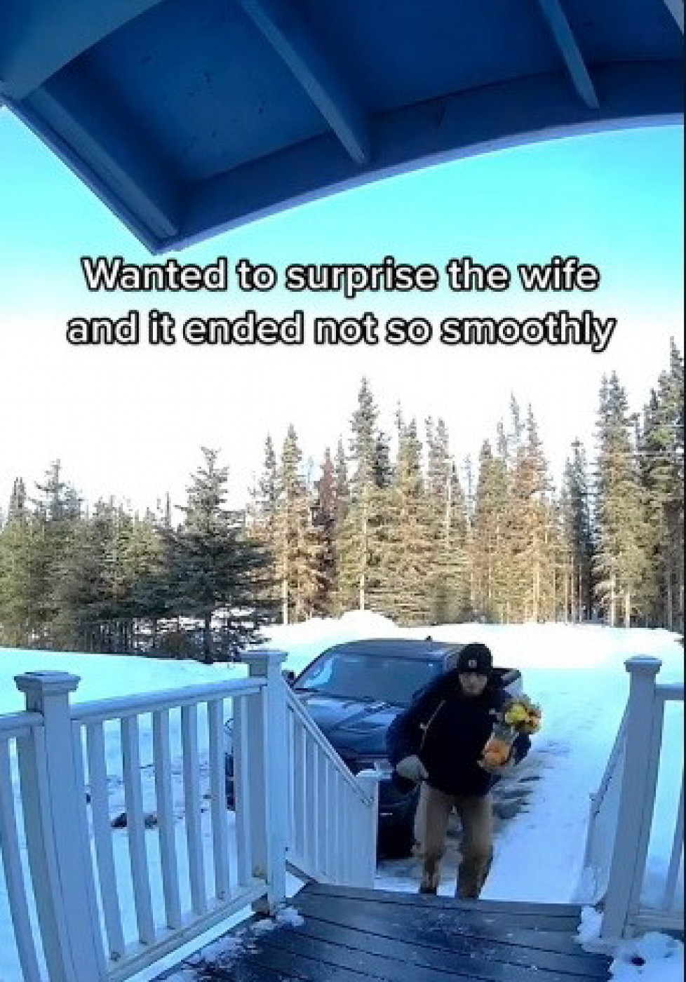 Budući da je bila zima, a da se taj deo ispred kuće zaledio, muškarac nije mnogo obraćao na to već je jurio ka svom cilju, našavši se vrlo brzo na podu zbog svoje neopreznosti. Prilikom pada čula se buka nakon čega je njegova žena istrčala ne bi li mu pomogla.