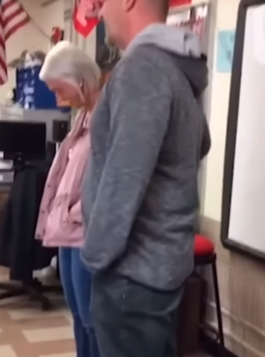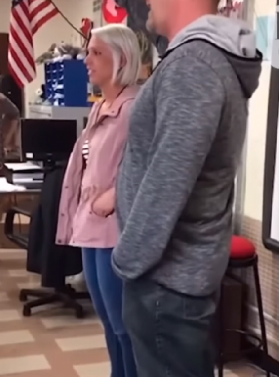 Neko od učenika je uspeo da usnimi trenutak kada se dvoje učitelja, muškarac i žena, nalaze očigledno pred gomilom dece koja pohađaju tu školu. Njih dvoje stoje ispred nastavničke table, dok plavokosa žena vidno zbog neprijatnosti drži glavu pognutu ka dole. Prizor njih dvoje liči više na dvoje učenika koji su izvedeni ispred table zato što su pričali na času. Ovaj učitelj preuzeo je glavnu “krivicu” na sebe i objasnio đacima celu priču.