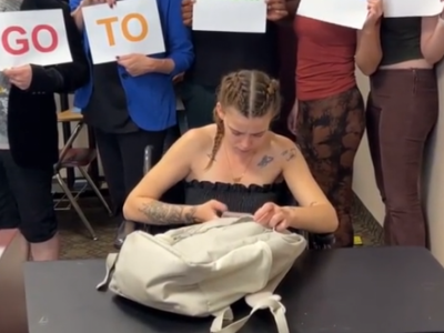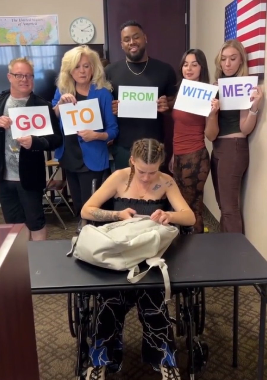 Kad se devojka konačno spakovala i okrenula kolica kako bi krenula kući, ugledala je grupu u kojoj su bili što njeni profesori, što kolege koje drže transparente. Bila je u trenutku zatečena, ali i dalje nije videla ko je to poziva na maturu, budući da se dečko skrivao iza ovih ljudi. Kad je videla ko je u pitanju njeno lice se ozarilo, ali je od šoka jedva uspela da klimne glavom u znak pristanka. Devojka je u neverici rukom prekrivala usta, na ivici suza, ovog puta suza radosnica. Dvoje drugara iz istog odeljenja na kraju su se i zagrlili, a momak je izvezao dalje njena kolica.