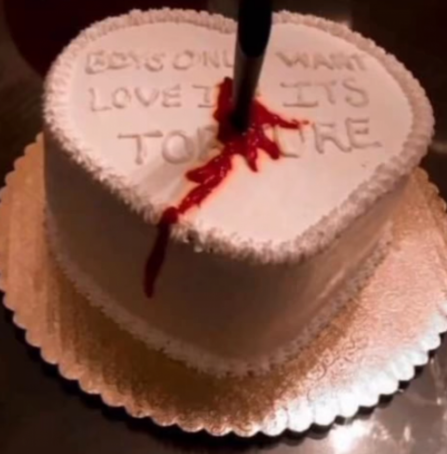 Jedan snimak postao je rado gledan na internetu i još rađe prosleđivan, a na njemu je slavljenica rođendana kojoj pristiže torta u obliku srca. Takođe je u pitanju bela torta ukrašena šlagom, dok devojka sa snimka drži i veliki kuhinjski nož. Svi u lokalu gde je slavlje očekuju kako će ova dama diskretno iseći parčiće torte, međutim, ona kreće da probada tortu iz koje počinje da curi crvena želatinasta tečnost, koja predstavlja krv.