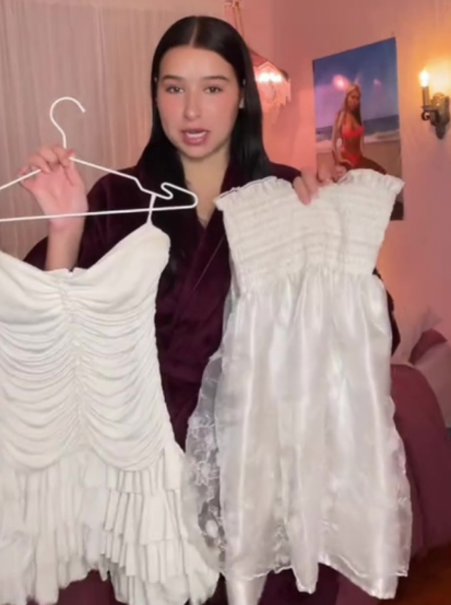 Ona je rešila da ne kupuje ništa specijalno za tu priliku kako ne bi trošila novac, već će obući nešto iz svog ormara. Planski se opredelila da obuče belu mini haljine koje su obe u beloj boji. Namerno se odlučila za belu boju, kako bi parirala mladi, pošto je poznato da se bela haljina na venčanja ne nosi. Na pitanje zašto uopšte ide na tu svadbu, kratko je imala da poruči.