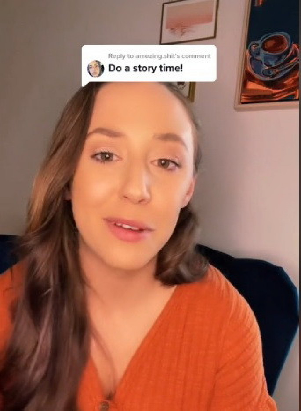 U seriji od nekoliko delova ona je na Tiktoku podelila trenutak saznanja da je verenik vara bukvalno na dan venčanja. Pošto je bio plan da se uda u septembru 2017. godine ona je otkrila da se danima unazad nije osećala dobro.
