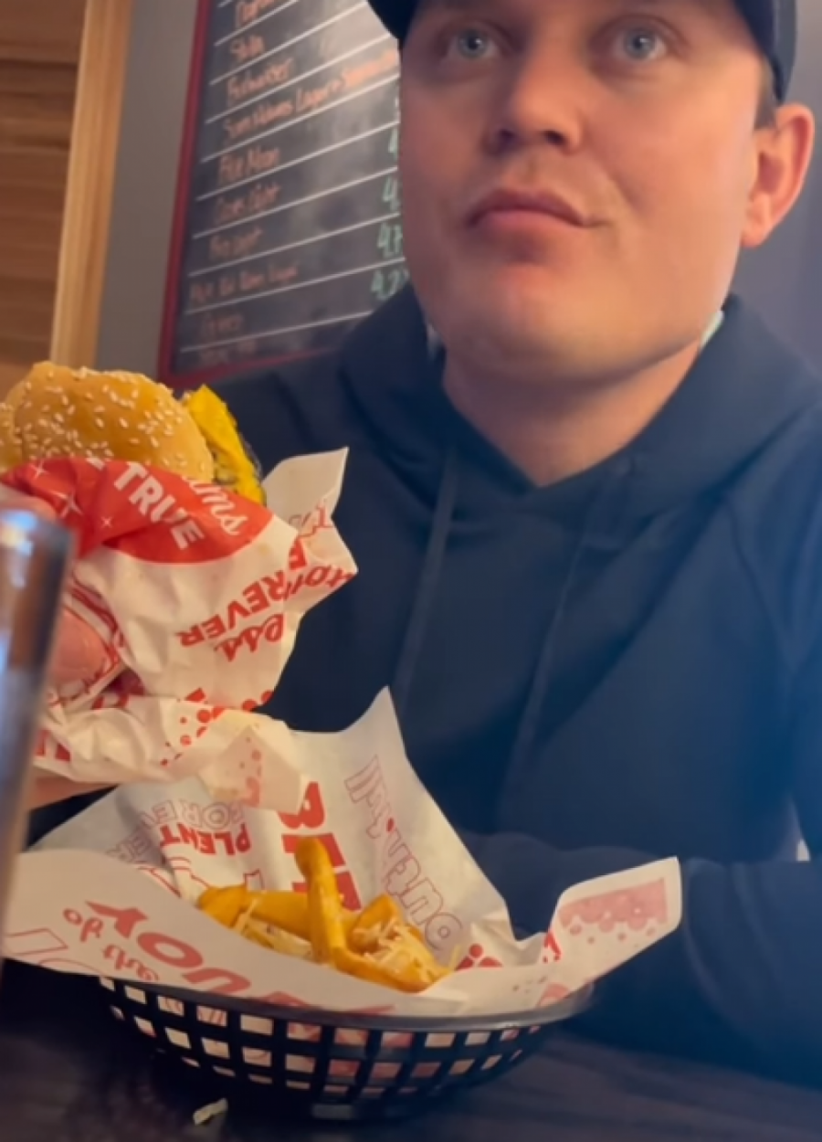 Njega je supruga snimila dok je sa velikim apetitom jeo hamburger uz pofrit. Njegov apetit bio je očigledan, a onda mu je žena suptilno rekla da ne naručuje desert. On je na trenutak zbunjeno zastao i upitao je “Zašto?”