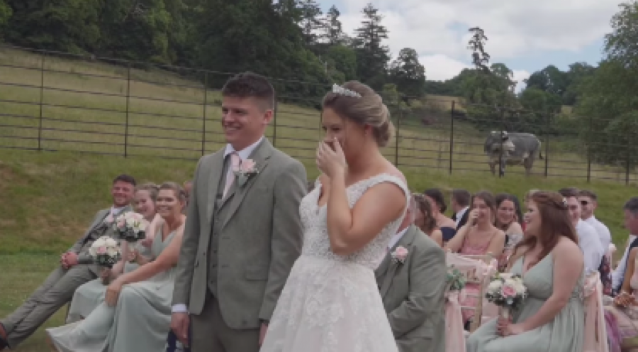 Životinja je opušteno šeta po susednom imanju, budući da je venčanje bilo na otvorenom i po svoj prilici na nečijoj farmi. Komšijska krava se tako osetila slobodnom da se oglasi ne jednom već čak tri puta, i to kako bi smeh gostiju i mladenaca utihnuo, a matičar nastavio.