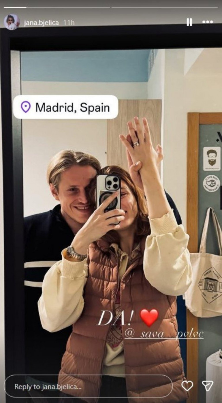 Na Instagramu je podelila emotivnu fotografiju sa Savom, uz jednostavan, ali efektnan komentar: "Da", čime je potvrdila da se njih dvoje spremaju za brak. U nastavku je pokazala i svoj zapanjujući verenički prsten - dijamantski, u obliku srca, koji je posebno upadljiv i ne može da prođe neprimećeno. Romantična večera u Madridu, gde je Sava priredio ovo iznenađenje, učinila je trenutak još posebnijim i nezaboravnim.