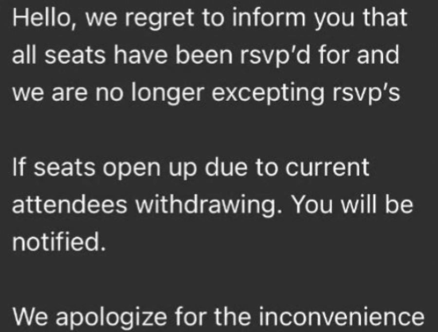Za one goste koji nisu brzo potvrdili prisustvo, stigla je poslednja poruka od mladenaca, u kojoj se obaveštava da su sva mesta već popunjena i da se više ne primaju nova. Oni se ujedno tim gostima izvinjavaju što ne mogu da ih prime na svadbu na koju su ih u početku zvali.