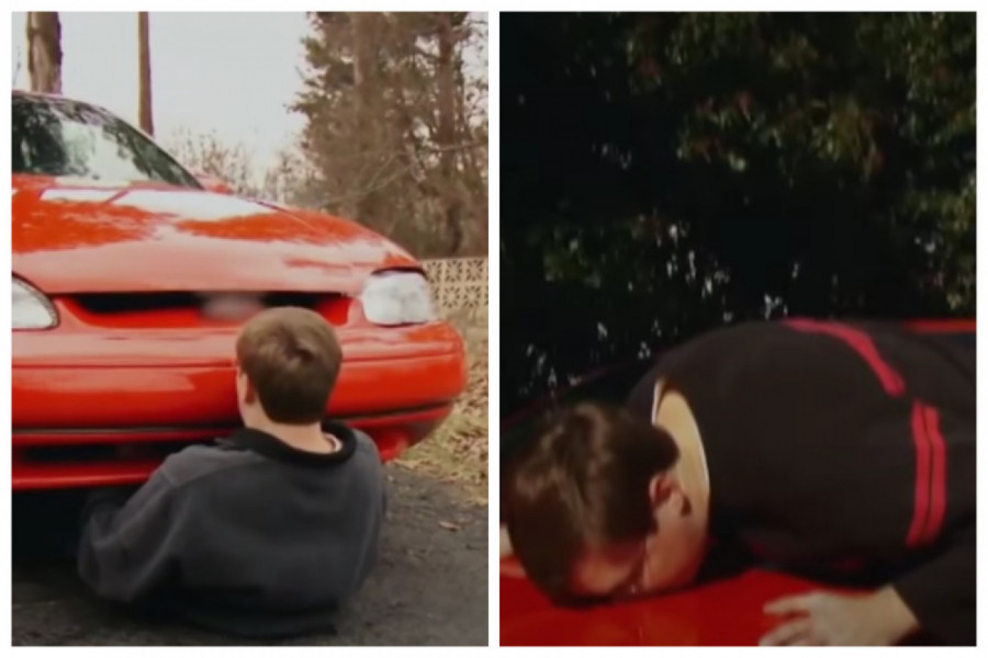 Na snimku se vidi kako ljubi haubu vozila dok se privija uz nju. On kaže: