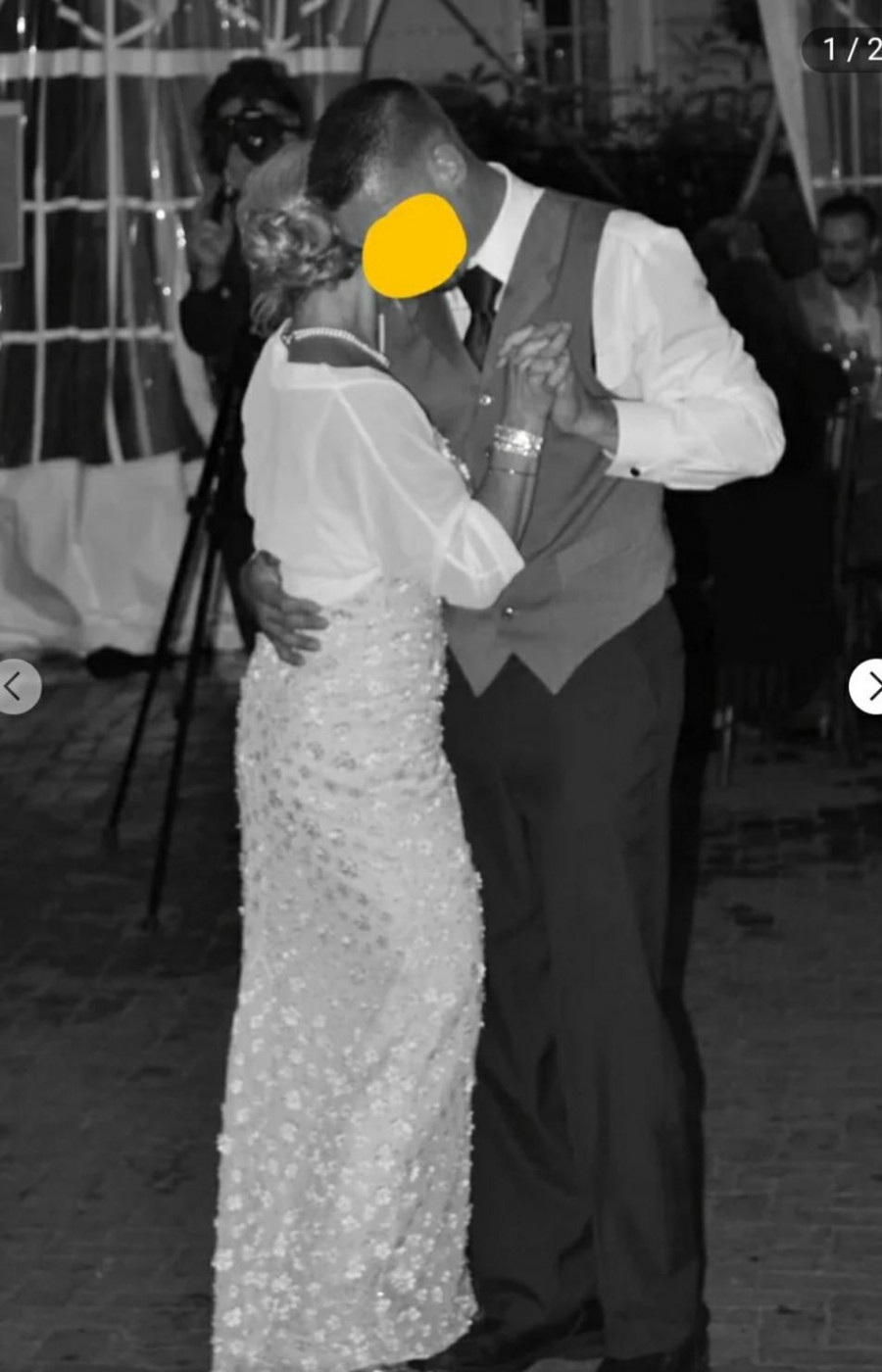 Naime, na fotografiji izgleda kao da ona i njen suprug plešu na podijumu, pri čemu su čvrsto i zaljubljeno pripijeni jedno uz drugo. Ona je u beloj svetlucavoj haljini i sa kosom elegantno pokupljenom u nisku punđu, isprepletanu s nekoliko kikica. Vidi se i zgodni muškarac u elegantnom odelu.