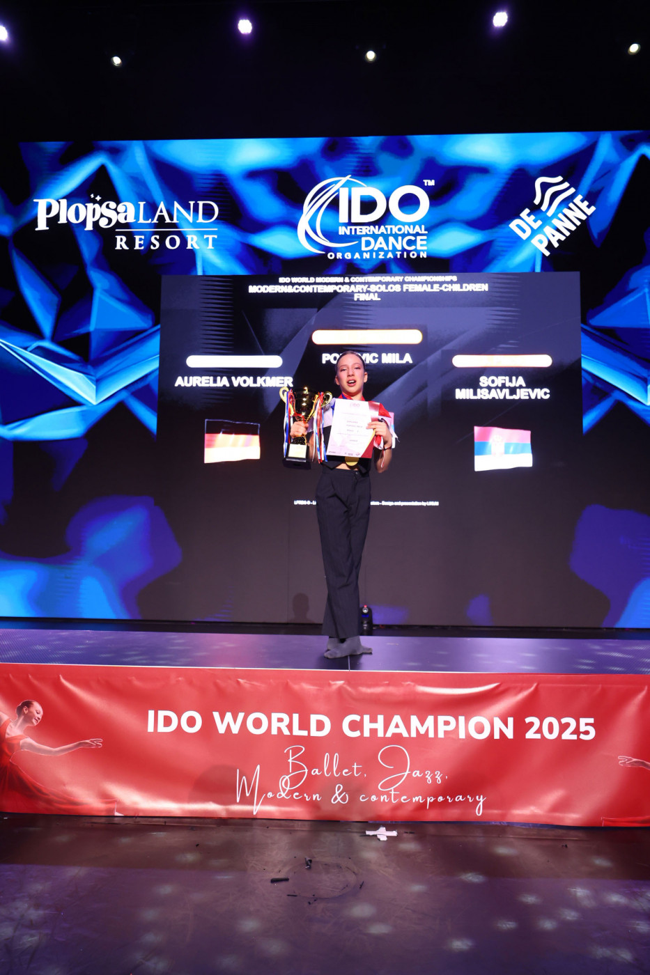 I tu dolazimo do krune njenog dosadašnjeg zalaganja - prvog mesta na svetskom takmičenju u savremenom plesu u solo tački, kao i dodatne tri zlatne medalje na istom takmičenju u kategorijama duo, mala grupa (do sedam plesača) i formacija. Za ovaj nastup spremala se godinu dana. Tremu pred izlazak na scenu je imala, ali malu. Izvela je svoj ritual - prekrstila se, poljubila ruku i kucnula u pod i pokidala. A momenat proglašenja pobednika?