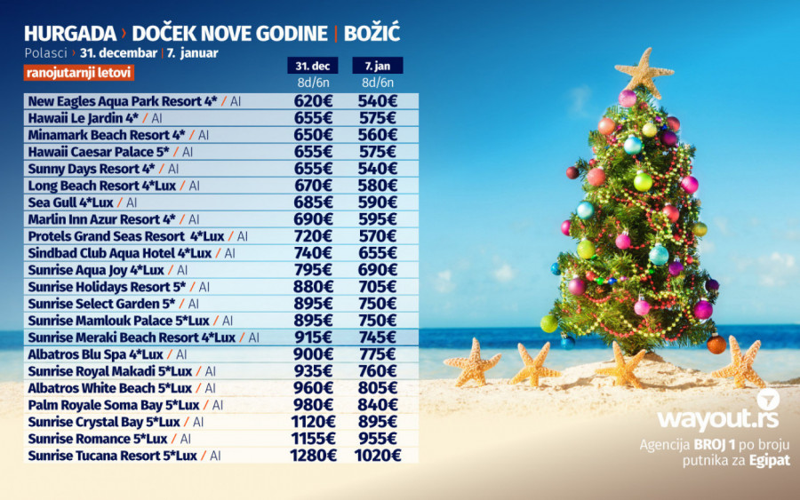 Ukoliko sanjate da Novu 2023. dočekate na plaži i uz toplo more, onda je za vas prava destinacija čuveno egipatsko letovalište Hurgada. Turistička agencija Wayout već sada u ponudi ima doček Nove godine u Hurgadi po pristupačnim cenama. Malo je poznato da tradicija proslave Nove godine u ovog zemlji vuče korene iz drevnog Egipta. Danas se slavi na različite načine, a za turiste se obavezno organizuje raskošna proslava u luksuznim rizortima uz novogodišnju dekoraciju. Doček Nove godine na pesku Crvenog mora sigirno će biti nešto što ćete pamtiti celog života.
