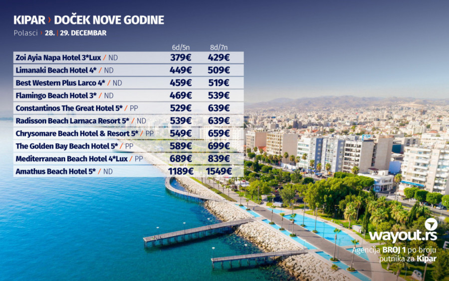 U ponudi Wayout agencije je još jedna sjajna morska destinacija - Kipar. Ostrvo na kome je po legendi iz morske pene rođena Afrodita za mnoge je najlepše baš u vreme novogodišnjih praznika. Dnevne temperature su između 20 i 23 stepena, more kritalne tirkizno-plave boje, a priroda buja oporavljena nakon letnjih suša. Zato se pripremite za nestvaran prizor okićenih palmi, Deda Mraza i praznične atmosfere, kao i dočeka na plaži koji će ispuniti sve vaše snove. Kiprani posle ponoći tradicionalno lome vasilopitu, kolač napravljen od domaćih pomoradži i brendija. Na njemu je uvek natpiss "Nova godina" od badema. Običaj je da glava porodice prekrsti kolač (kao znak blagoslova) i iseče ga na parčiće od kojih se prva dva odvajaju za crkvu i Isusa, i siromašne. Ostali parčići dele se članovima porodice i veruje se da ko pronađe srebrni novčić u kolaču, njega će sreća pratiti cele godine.