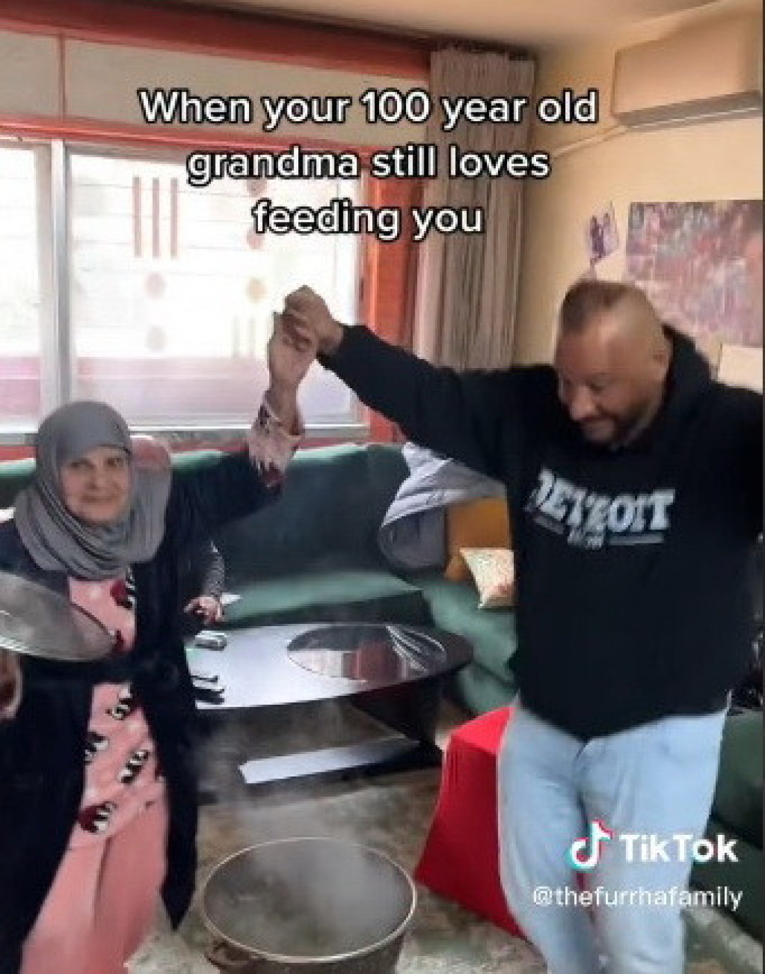 Za to vreme njih dvoje plešu oko tradicionalnog rapskog jela "davali" ili jednostavnije rečeno modifikovane varijante naše sarme. Tiktoker oduševljeno gleda u tradicionalno jelo dok ga baka ponosno drži za ruku i predvodi kolo. Snimak je nasmejao njegove pratioce koji su prokomentarisali kako vremešna starica izgleda odlično za svoje godine, pa su pohvalili i njene kulinarske sposobnosti.