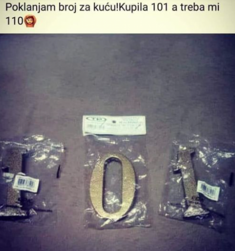 Fotografija oglasa na Fejsbuku tako je postala viralna. Naime, žena koja je s naših prostora, najverovatnije iz Bosne, a čije je ime sakriveno, postavila je oglas na kom poklanja broj za kuću. Glavni problem bio je taj što je njen broj kuće navodno 110, a ona je naručivši preko interneta dobila 101. Činjenica je, međutim, da su brojevi bili odvojeni, to jest ona je dobila dve jedinice i nulu, te je tako mogla da sastavi željeni broj bez problema, ali to očigledno nije shvatila.