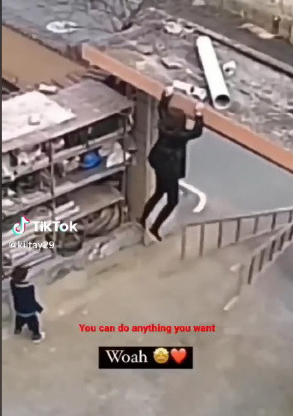 Bespomoćna žena nije znala šta da radi u tom trenutku jer je bila prilično visoko od tla. Kada video šta se dešava, dotrčao je njen mali sin koji je sve posmatrao iza pa je pokušao da majci priskoči u pomoć. Dečak je pažljivo malo po malo uspeo da podigne merdevine i da ih primakne majci ispod nogu kako bi se ona uspravila i konačno bila stabilna.