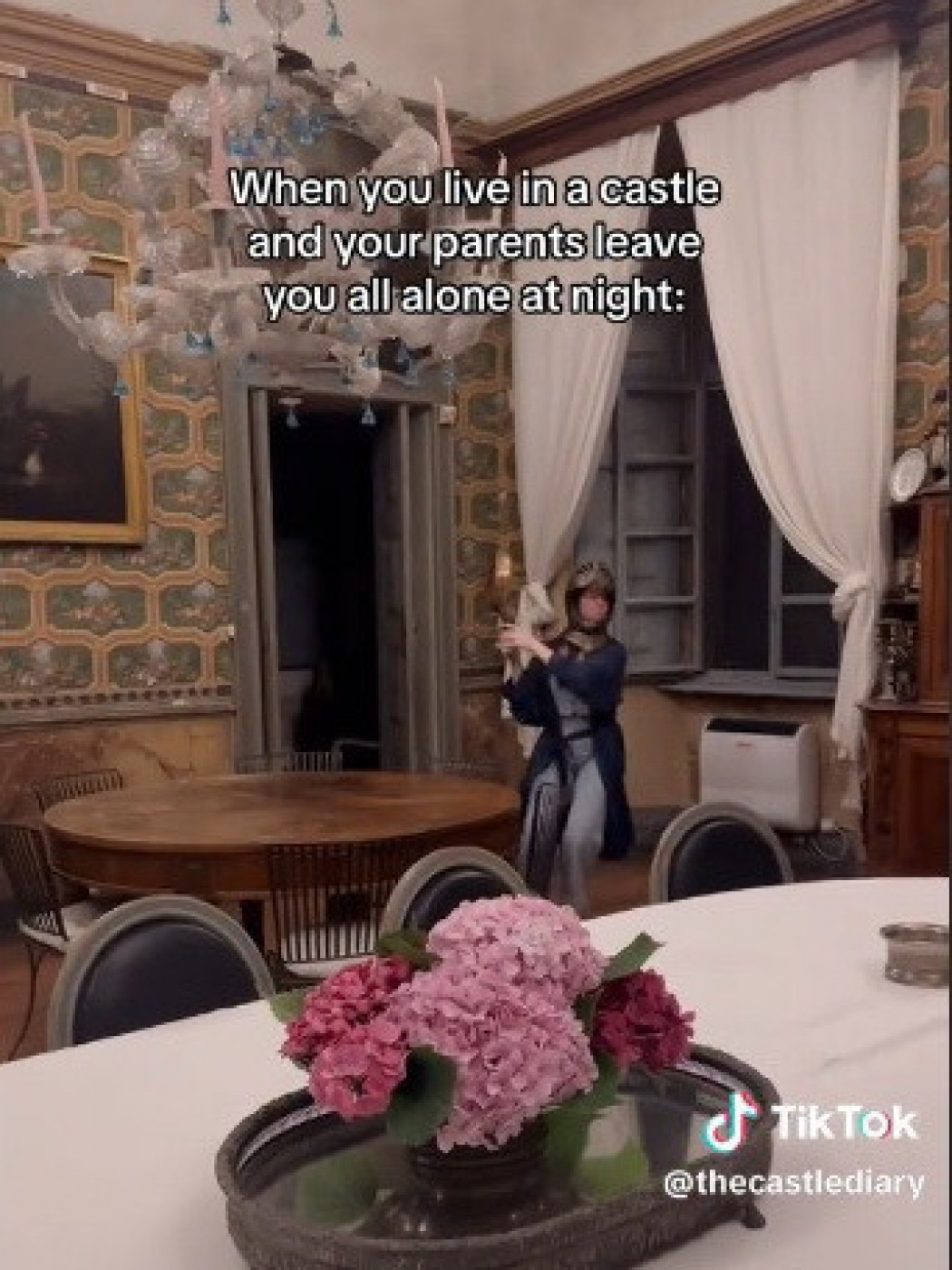 U jednoj od svojih objava ona je pokazala da da se ne oseća ni malo prijatno kad u zamku ostane sama. U kratkom video snimku koji je postavila na Tik Tok ona je prikazala kako je ispratila roditelje, a potom zaključala vrata za njima.