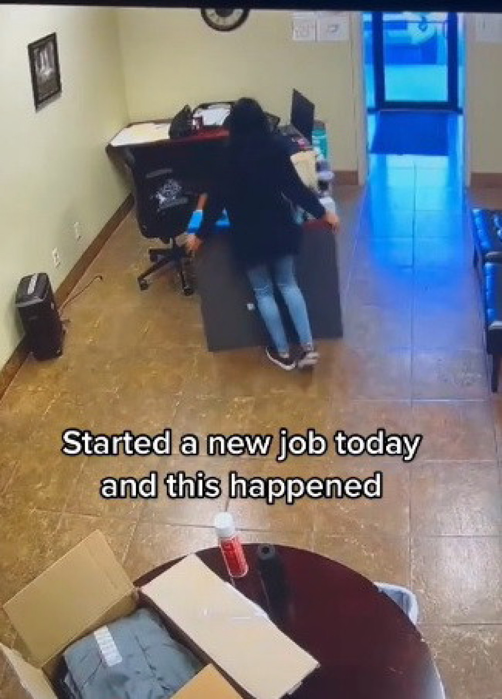 Naime, dok se ona spremala da startuje na novom radnom mestu, usnimljena je sigurnosnim kamerama kako se približava stolu, želeći da upozna radno okruženje. Dok je pomerala sto malo u stranu, pripremajući se da startuje sa poslom, doživela je veliku neprijatnost. Kako se dohvatila radnog stola, on se u jednoj sekundi raspao, a ona se našla na podu. Sav radni materijal, knjige i ono što se nalazilo na njemu, našli su se zajedno sa njom na zemlji. Devojka se smejala i pokušavala da dođe sebi, ne shvatajući šta joj se upravo desilo, kada se pojavio jedan kolega na vratima kako bi video šta se dešava i da li je dobro. Tiktokeri su imali da podele neka slična iskustva, dok su se neki šokirali "kvalitetom" stola.
