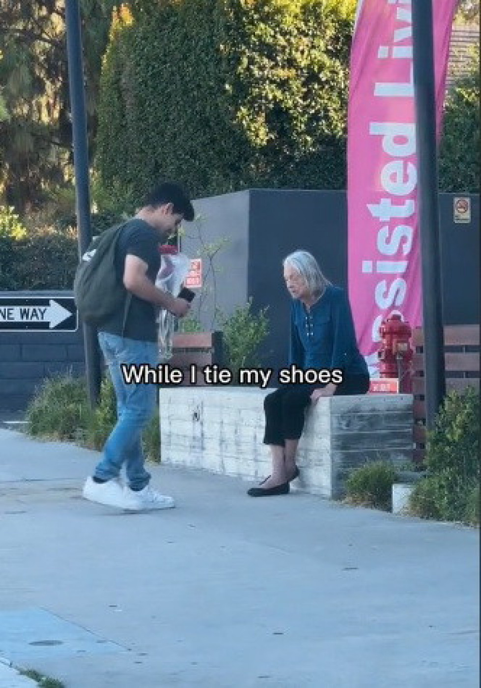 Dok je neka starica sedela na stanici čekajući autobus, ovaj mladić joj je prišao sa molbom da mu pridrži buket cveća dok zaveže pertle na patikama.