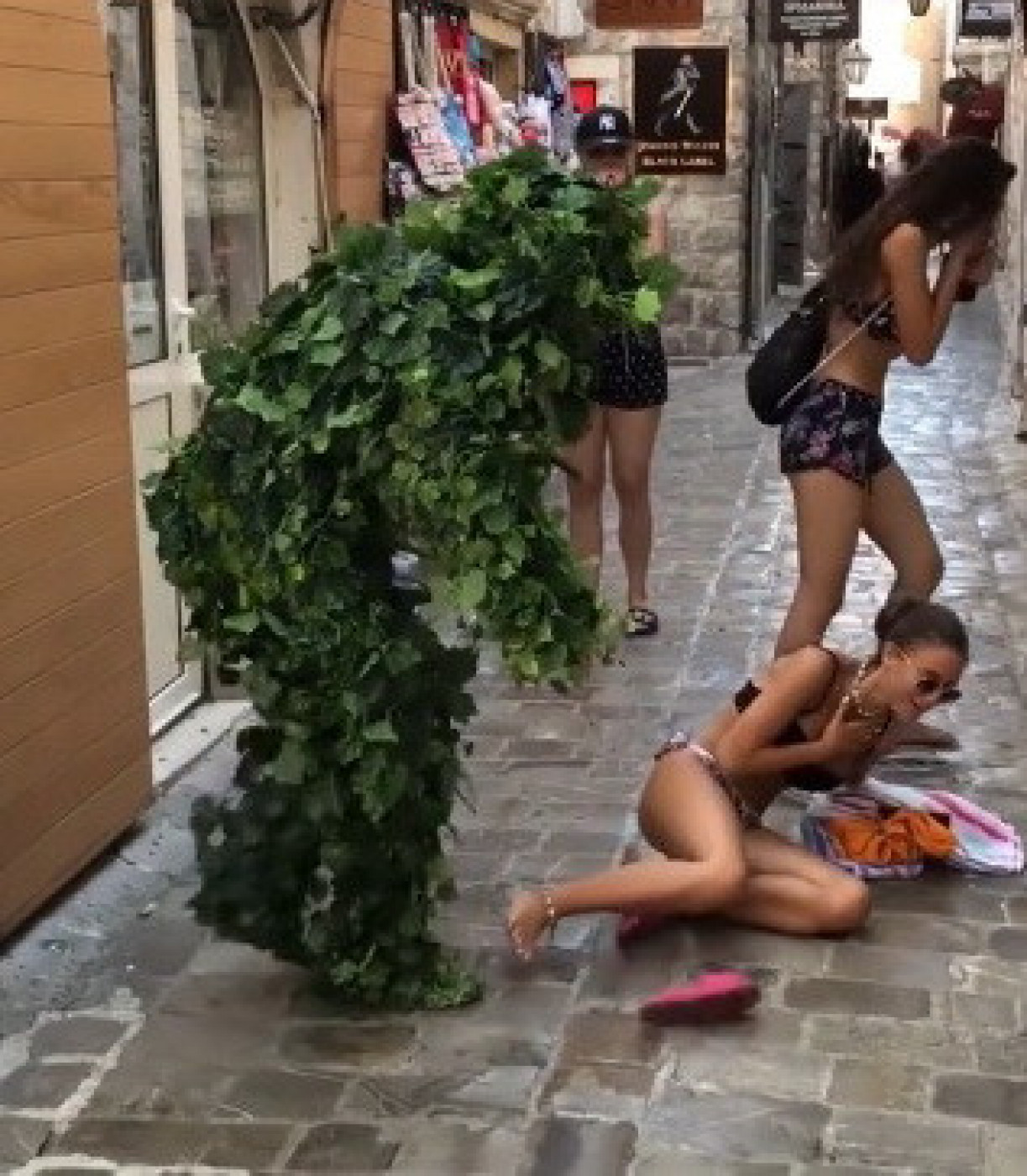 Kamuflirani čovek u lisnatoj biljci stajao je sa strane, pored ulice iščekujući prolaznike ispred kojih je izlazio i bukvalno ih prepadao.